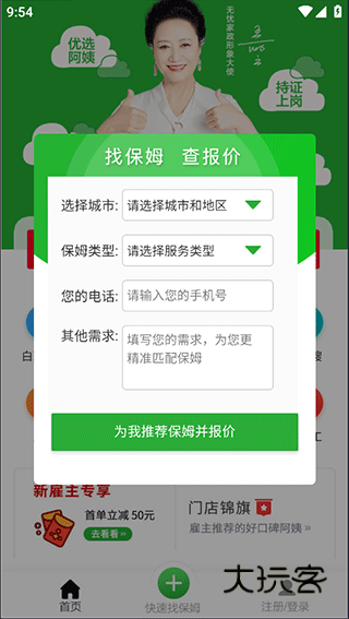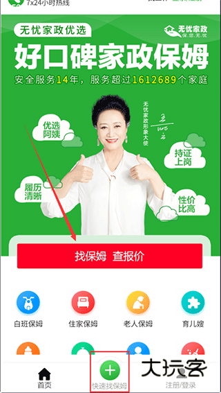 1、打开无忧家政app后,点击“找保姆 查报价”或者下方的“快速找保姆”;