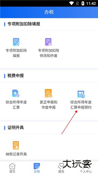 3、也可以在下面菜单栏选择办税,然后点击综合年度汇算申报预约