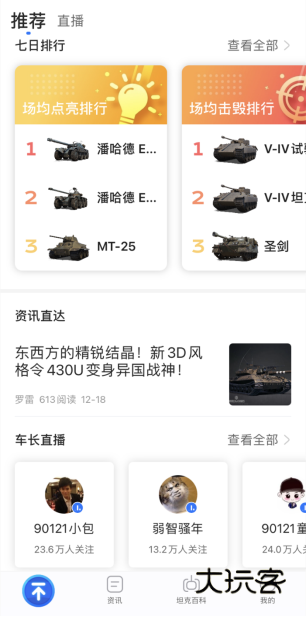 坦克营地app作为军武巨制坦克世界游戏的官方助手APP,集合了游戏资讯、坦克百科、国服战绩、个人生涯,活动、直播,短视频等全方位内容。