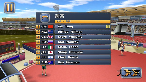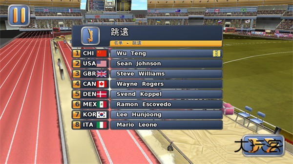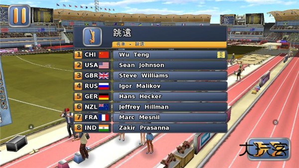 2、进入比赛之后,可以看到需要参赛的名单,来自各个不同的国家,接下来以跳远为例为各位小伙伴介绍一下游戏的玩法。