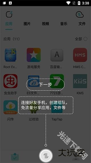 2、连接好友手机,创建组队,免流量分享应用,文件等;