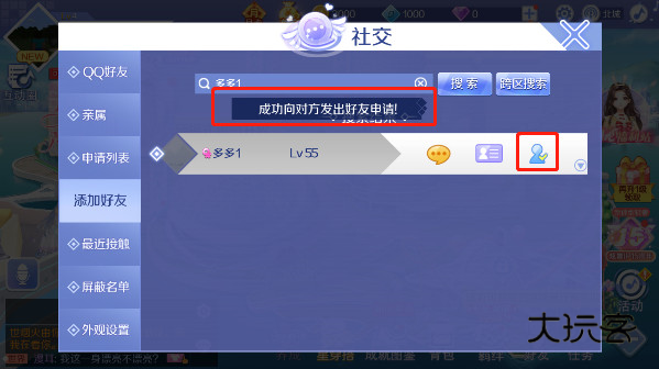 5、如下图提示成功向对方发出好友申请,右边人型图标也打上了勾,接下来等着对方通过你的好友申请即可。