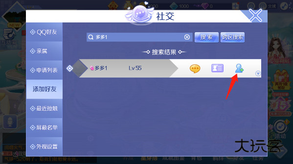 3、在社交界面选择添加好友选项,在输入框输入好友的游戏名称,点击搜索。