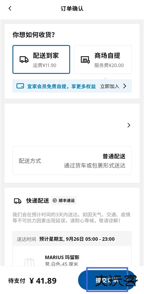 若选择配送到家方式,添加地址,点击【提交订单】进行付款即可。