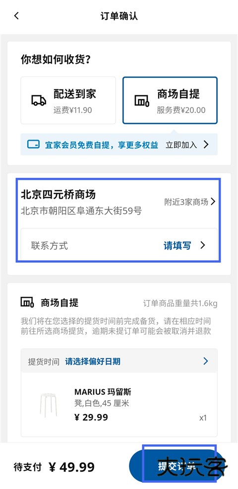 6、若选择商场自提方式,选择自提商场,填写联系方式,点击【提交订单】即可。