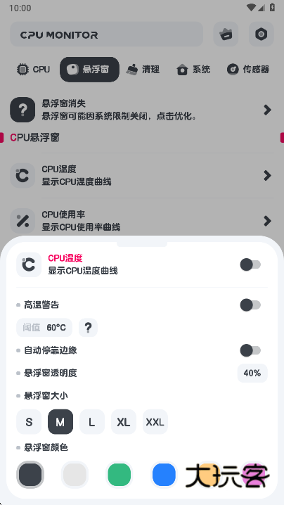 桌面悬浮窗和状态栏悬浮窗实时展示 CPU 温度、电池温度、内存使用率,强大又方便,实时信息想看就看。