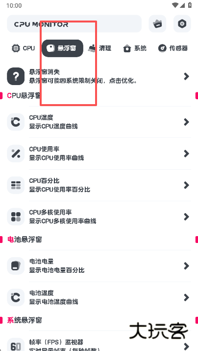 2、接着按照自己的需求开启相应的硬件检测悬浮窗并赋予软件悬浮窗口权限即可