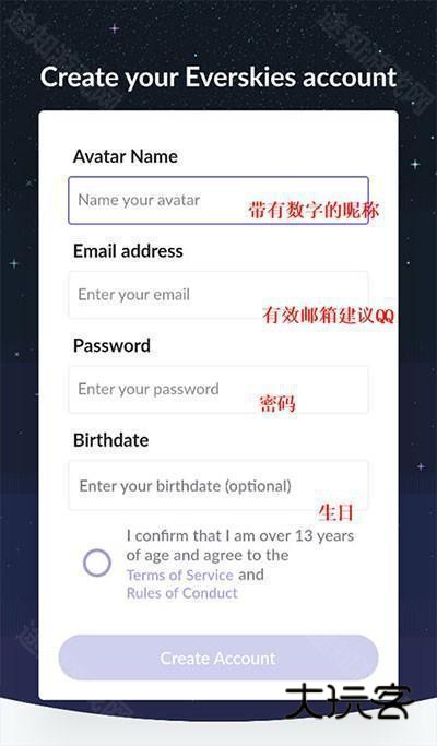 5、输入昵称、有效邮箱、密码、生日等信息后创建角色和账号,勾选协议,点击创建。
