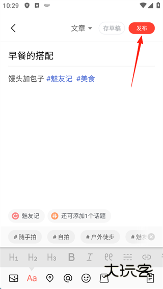 6、编辑好内容后,点击屏幕右上角的“发布”。