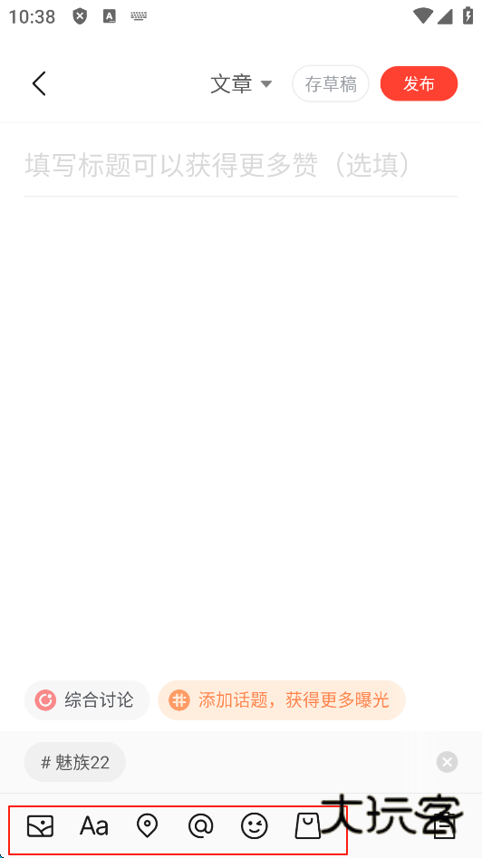 3、在屏幕的最下方拥有许多的功能,比如上传相片,字体的调整,地点的添加等等功能。