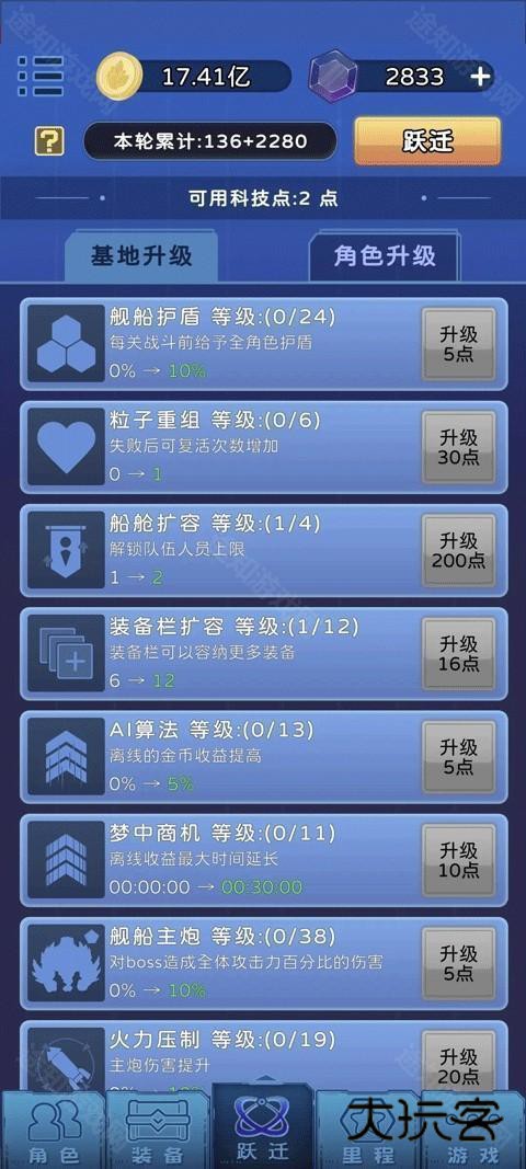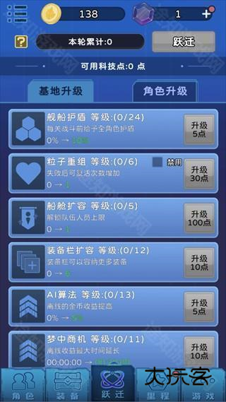 9、跃迁后必点(1、舰船主炮(自动拉BOSS),2、船舱扩容(上阵变成5个人,必点)3、宇宙招聘书(至少可以升到4星)。第二页的角色升级,随便点点力量、攻速、剑术磨练就好了)