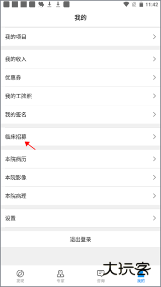 1、选择下方菜单栏“我的”界面,点击“临床招募”。