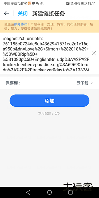 3、然后输入链接地址,支持直链下载和磁力(即bt文件链接下载新形式)、电驴链接(比bt更早的一种下载方式),例如下图中就是输入了一条磁力链接