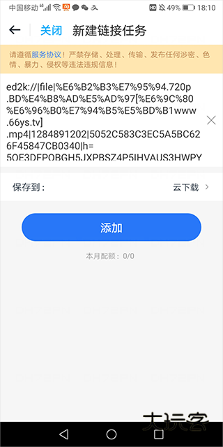 4、这里输入的是电驴链接,输入完成后选择保存位置,然后点击【添加】即可开启下载