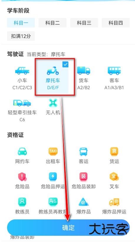 3、在弹出的选项中点击“摩托车”,然后点击“确定”即可。