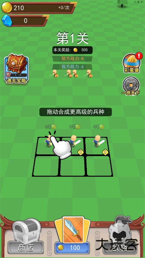 1、下载进入小小统帅游戏,拖动小兵进行合成更高级的兵种。