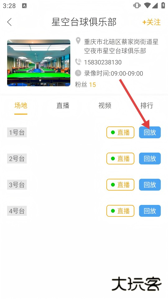 3、场馆详情页1号台点击【回放】,进入录像回放界面,观看历史台球视频。