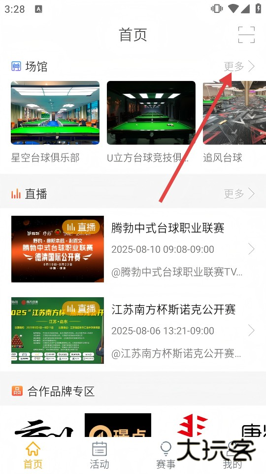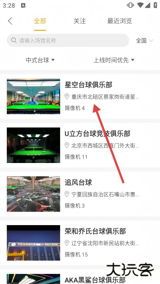 1、首页场馆栏点击【更多】,进入全部台球场馆列表,浏览全国场馆信息。