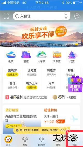 2、统一管理机场、酒、火车票,提供网上值机、退票、打车等服务。