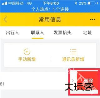 4、在需要删除的乘客条目位置向左滑,点“删除”按钮,即可删除乘客信息。