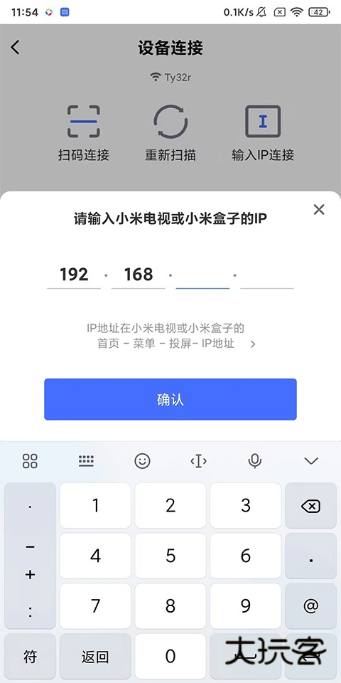 4、或使用输入IP连接:IP地址在小米电视或小米盒子的首页-菜单-投屏-IP地址;