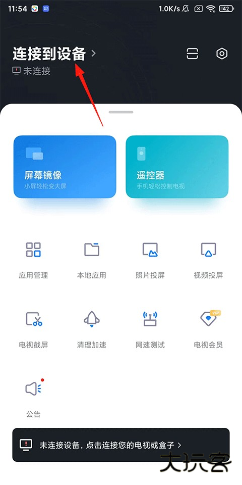 1、打开小米电视助手安卓版APP,在首页点击【连接到设备】;