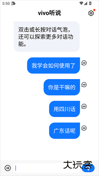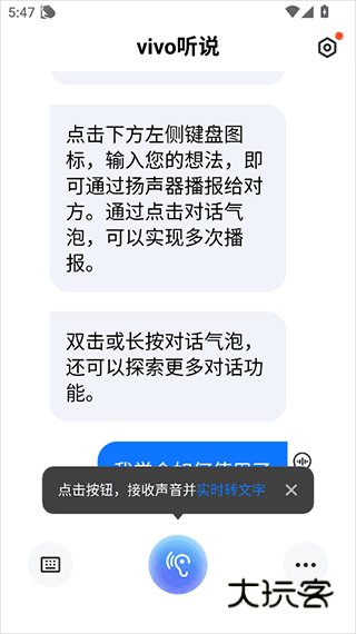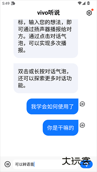 vivo听说是一款vivo旗下的智能语音助手软件。该软件主要服务于vivo手机的多场景沟通等口语交际场景,集实时语音转文字、文字播报、无障碍沟通等功能于一体,帮助用户跨语种交流,或者子啊不方便的时候实现语音转文字,文字转语音等语言便捷服务,同时也支持方言交流等小语言设置,非常的好用方便,快来下载试试吧!