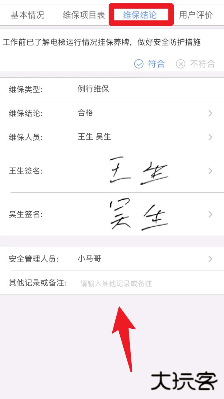 5. 维保完成后进入「维保结论」页填写结果,签署相关责任人签名并添加备注,确保记录完整。