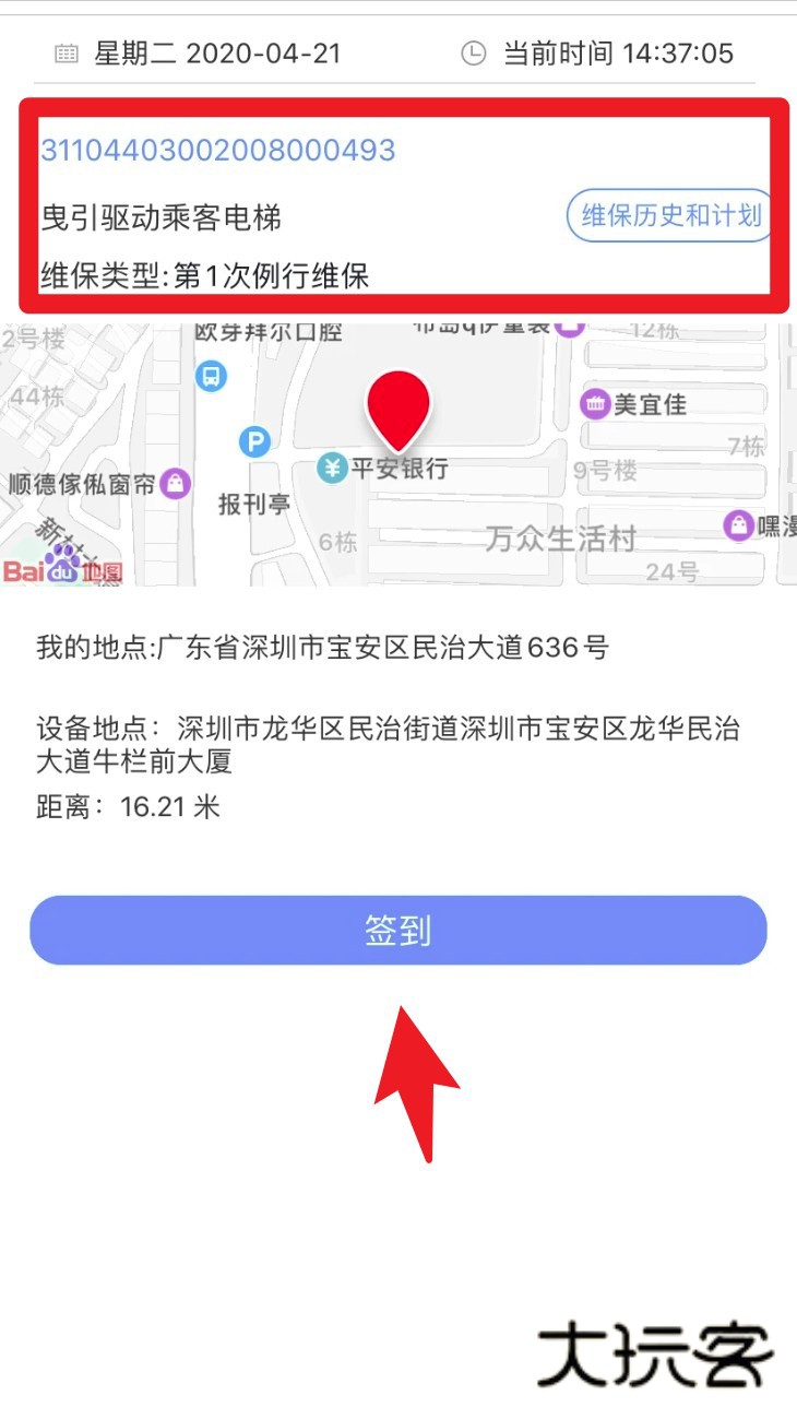 扫描使用标志上的二维码即可签到,无需手动输入电梯设备注册代码