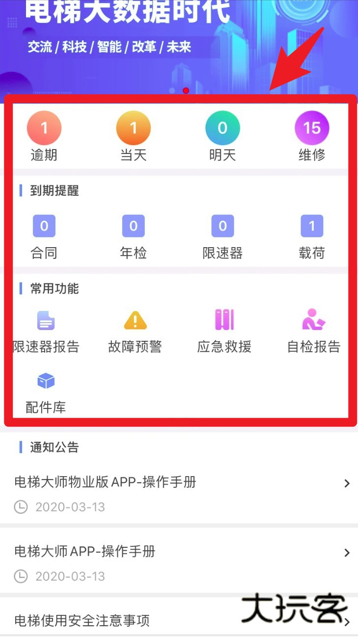 2. 登录成功后首页将显示维保提醒与常用功能,如报告上传、预警记录、救援登记等快捷入口。