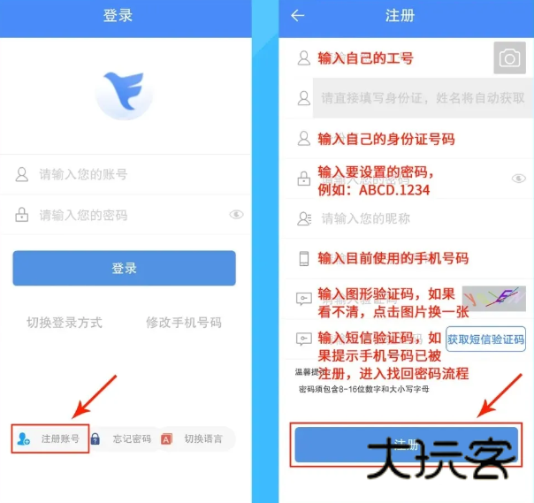 2、按照页面要求输入注册信息,比如你厂牌上的工号,密码,手机号码等信息,最后点击“注册”按钮