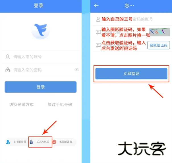1、打开飞鸽,点击下方“忘记密码”,进入找回密码页面,根据图示正确填写内容,填写完成后点击“立即验证”