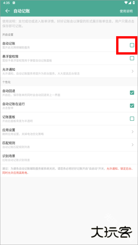 3、进来之后勾选【自动记账】,支付成功或进入账单详情,好好记账会以弹窗的形式展示账单信息,只需点击保存即可记账。