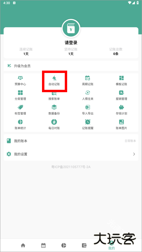启动应用程序打开记账页面,设置报销,并支持手动记账、自动记账等记账方式。