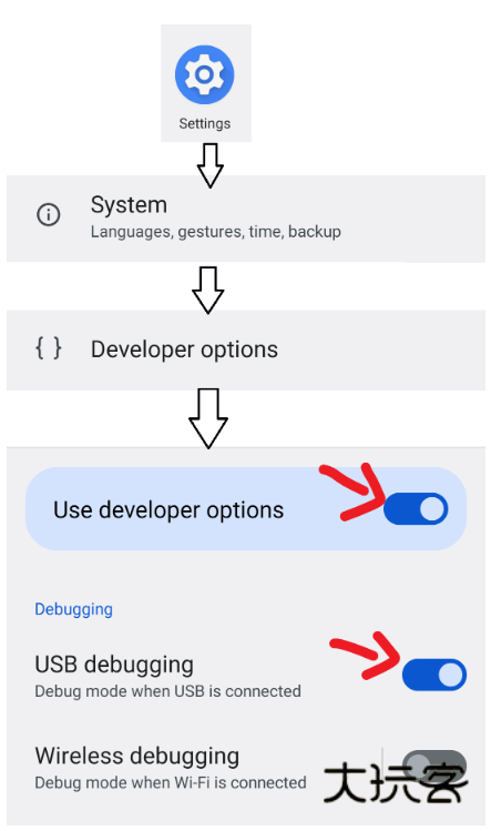 1、打开自己手机的设置,按照如下操作,启用开发者选项和USB调试。