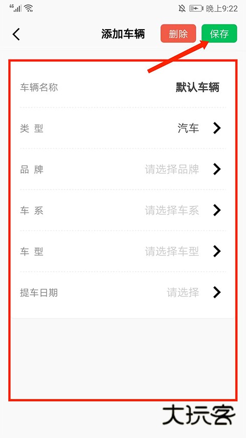 3、进入添加车辆界面,依次填写好【类型】、【品牌】、【车系】、【车型】以及【提车日期】后,选择右上角【保存】选项;