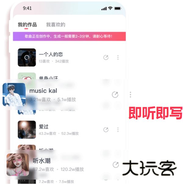 即听即写,我的作品,我喜欢的,歌曲正在创作中,生成一般需要2-3分钟,请耐心等待