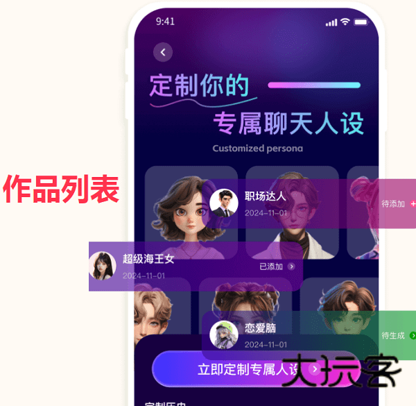 作品列表,定制你的专属聊天人设,职场达人、超级海王女、恋爱脑