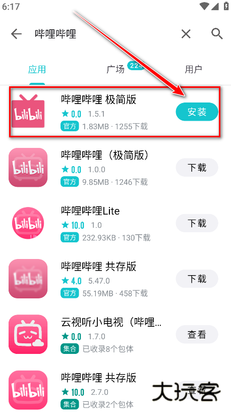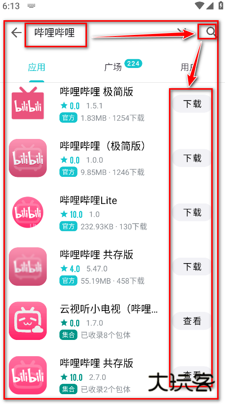 7.输入想要的软件或者游戏名称,小编以哔哩哔哩做演示,然后点击放大镜搜索,在下方显示出来的软件中选择自己想要的版本然后点击后面的下载即可。