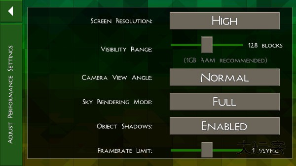 2、“settings”中的“performance”中,我们还可对游戏中的画质进行自定义设置,对于设备配置较低的玩家,可适当的降低画质,来提高游戏的流畅性。