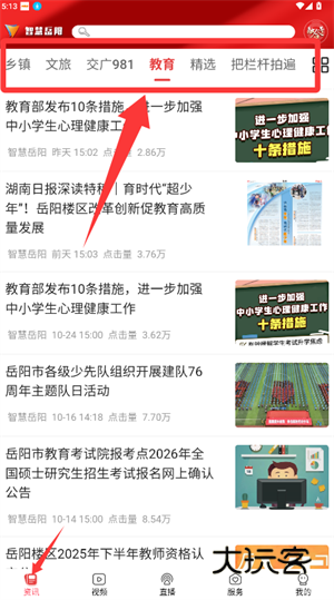2、进入资讯界面后,从乡镇、文旅等分类栏中选取教育板块浏览资讯。