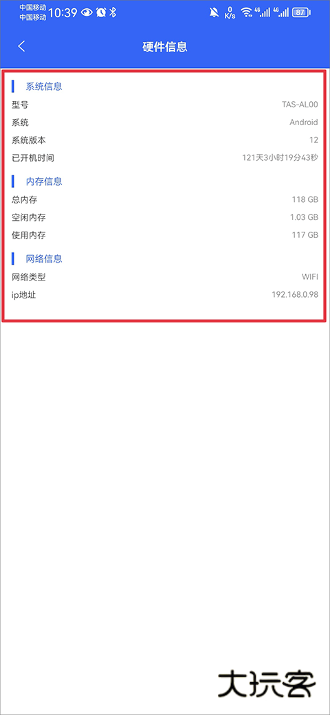 2、进入后即可查看手机设备的系统信息、内存信息、网络信息的详细数据