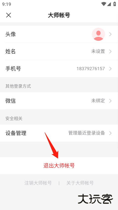 3、此时你应该进入了个人信息页面,选择【退出大师账号】就好了。