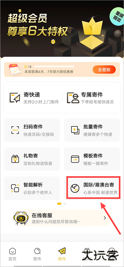 1、首先打开韵达快递app,在“寄件”页面可以看到有一个“国际/港澳台寄”;