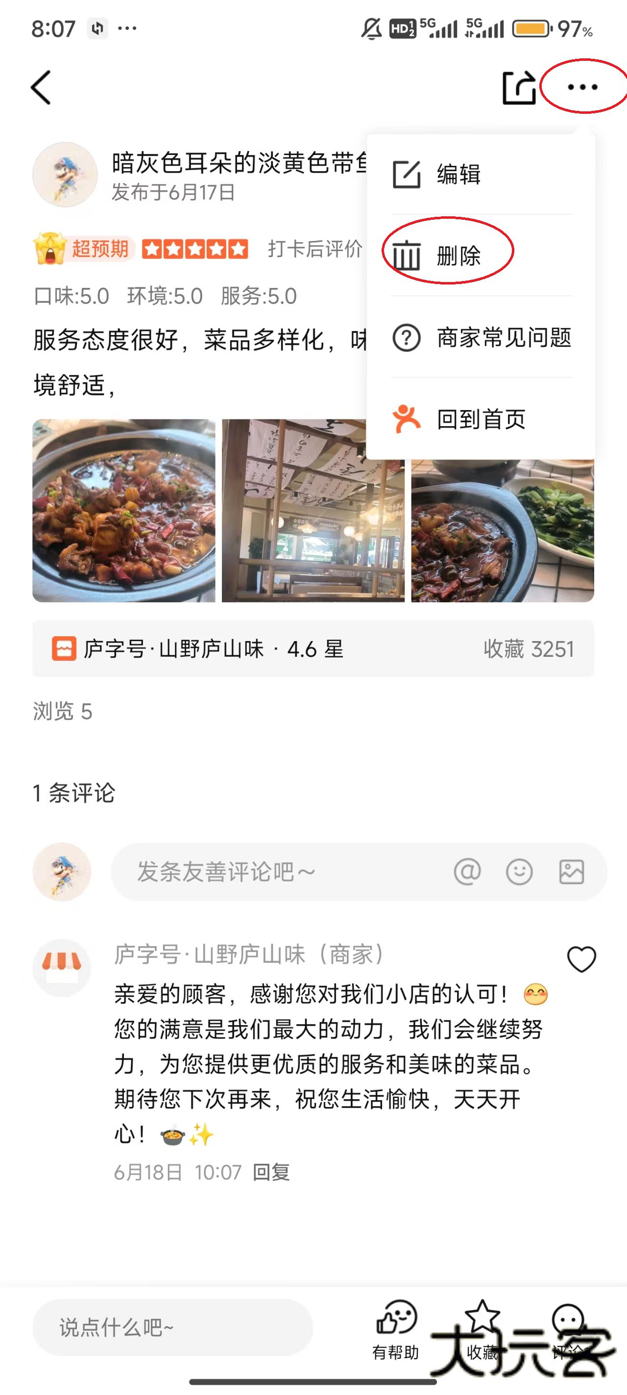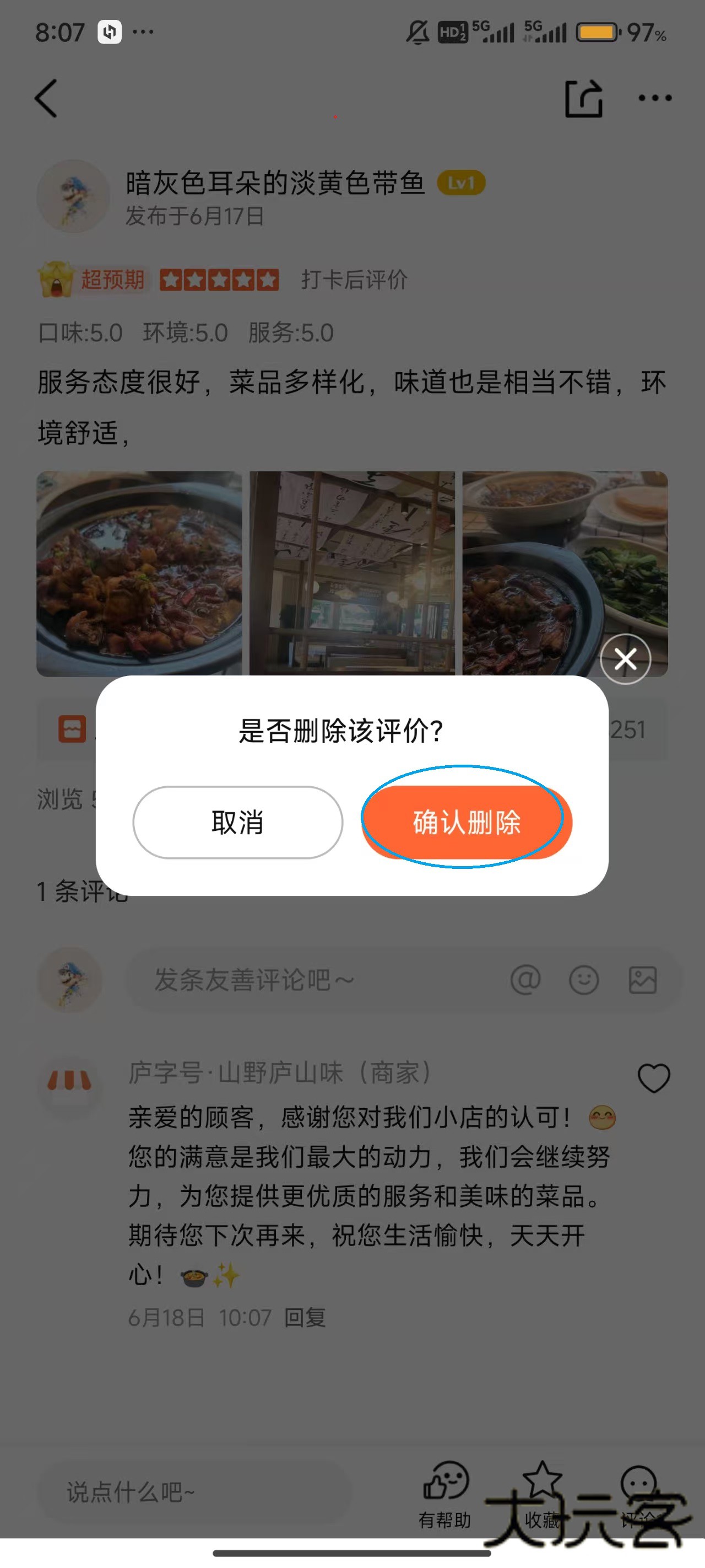 6、点击弹窗右侧的“删除”即可,这样就可以删除自己的评论了。