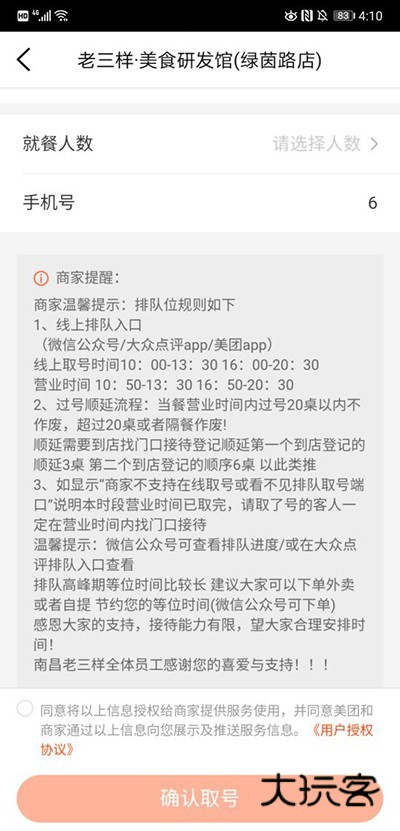 3、在商家排队页面,选择就餐人数后点击确认取号即可。