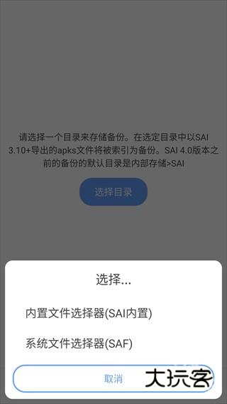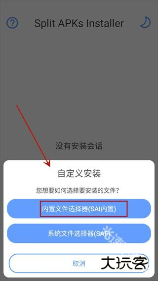 3、弹出安装提示,包括内置文件选择器(SAI内置)和系统文件选择器(SAF),用户可根据需求选择使用,这里以系统文件选择器(SAI内置)为例