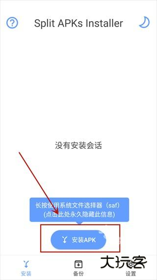 2、打开SAI安装器,进入应用主界面,包括安装、备份和设置栏目,在安装栏目选择【安装APK】选项