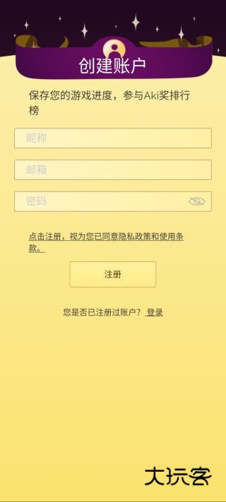 Akinator 想让您创建一个账号。您的 Aki 奖将会累计,您解锁的服装和 Geniz 金币也会同步。即使换了手机,这些记录都会同步。