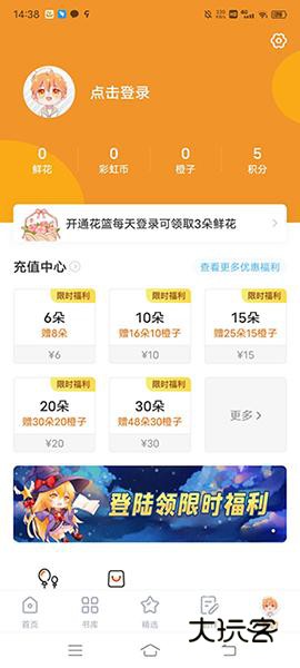 用户可在此充值花篮以及签到免费领取限时福利,除此之外用户所登录账号的积分、彩虹币等信息可这里查阅。